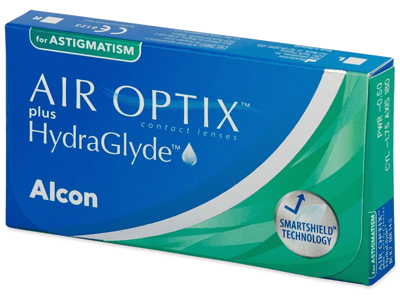 Αυτοί οι μηνιαίοι φακοί επαφής είναι κατασκευασμένοι από υλικό σιλικόνης-υδρογέλης και έχουν σχεδιαστεί για να διορθώνουν τον αστιγματισμό με την προστιθέμενη αξία του κυλίνδρου και του άξονα. Οι Air Optix plus Hydraglyde για αστιγματισμό έχουν υψηλή διαπερατότητα σε οξυγόνο και είναι χρωματισμένοι σε γαλάζιο χρώμα για ευκολότερο χειρισμό.