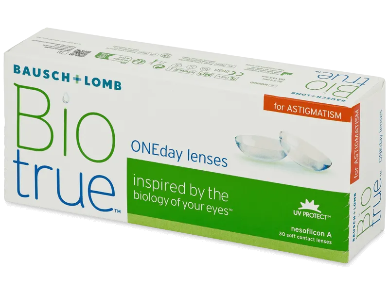 Δημιουργημένο με υλικό HyperGel (Nesofilcon A) για να εξασφαλίσει υψηλή περιεκτικότητα σε νερό και διαπερατότητα οξυγόνου, αυτοί οι φακοί Toric από την Bausch & Lomb παρέχουν εξαιρετική άνεση και απόδοση όλη την ημέρα.Το Biotrue ONEday για αστιγματισμό διατίθεται εδώ σε πακέτο των 30. Αυτοί οι καθημερινοί φακοί μιας χρήσης ανακουφίζουν όλες τις ενοχλήσεις που προκαλούνται από αστιγματισμό όπως πονοκεφάλους και θολή όραση.Υψηλή περιεκτικότητα σε νερό = Άνετη άνεση