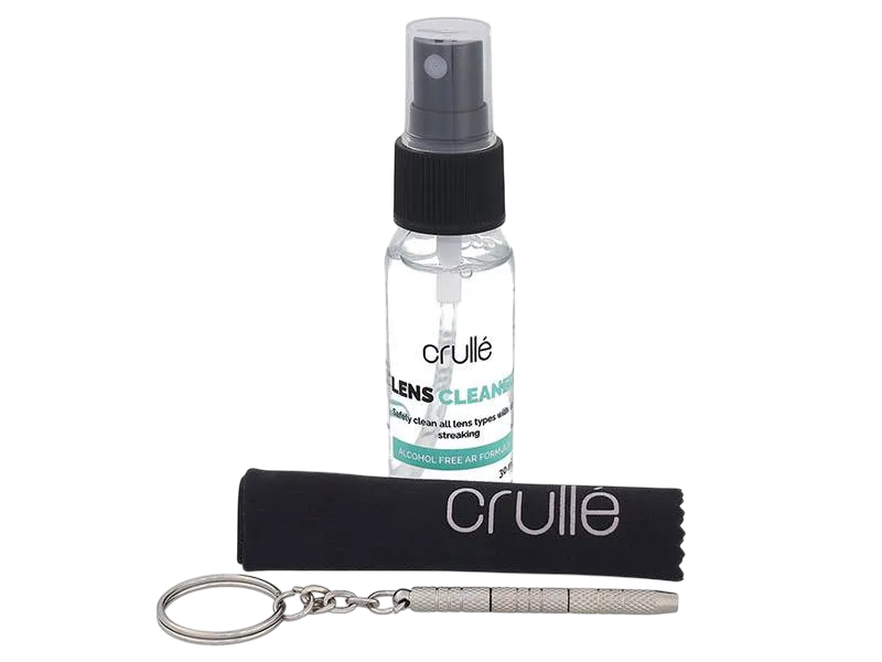 Αυτό το πρακτικό σετ καθαρισμού Crullé περιέχει ένα σπρέι καθαρισμού και ένα πανί μικροϊνών, τα οποία μπορούν να χρησιμοποιηθούν σε οποιονδήποτε τύπο γυαλιών. Αυτό το σετ περιλαμβάνει επίσης ένα κατσαβίδι μεγέθους ταξιδιού που σας επιτρέψει να σφίξετε εύκολα τις βίδες των γυαλιών σας σε περίπτωση που αρχίζουν να χαλαρώνουν. Όλο το σετ διατίθεται σε μια πρακτική, διαφανή θήκη.